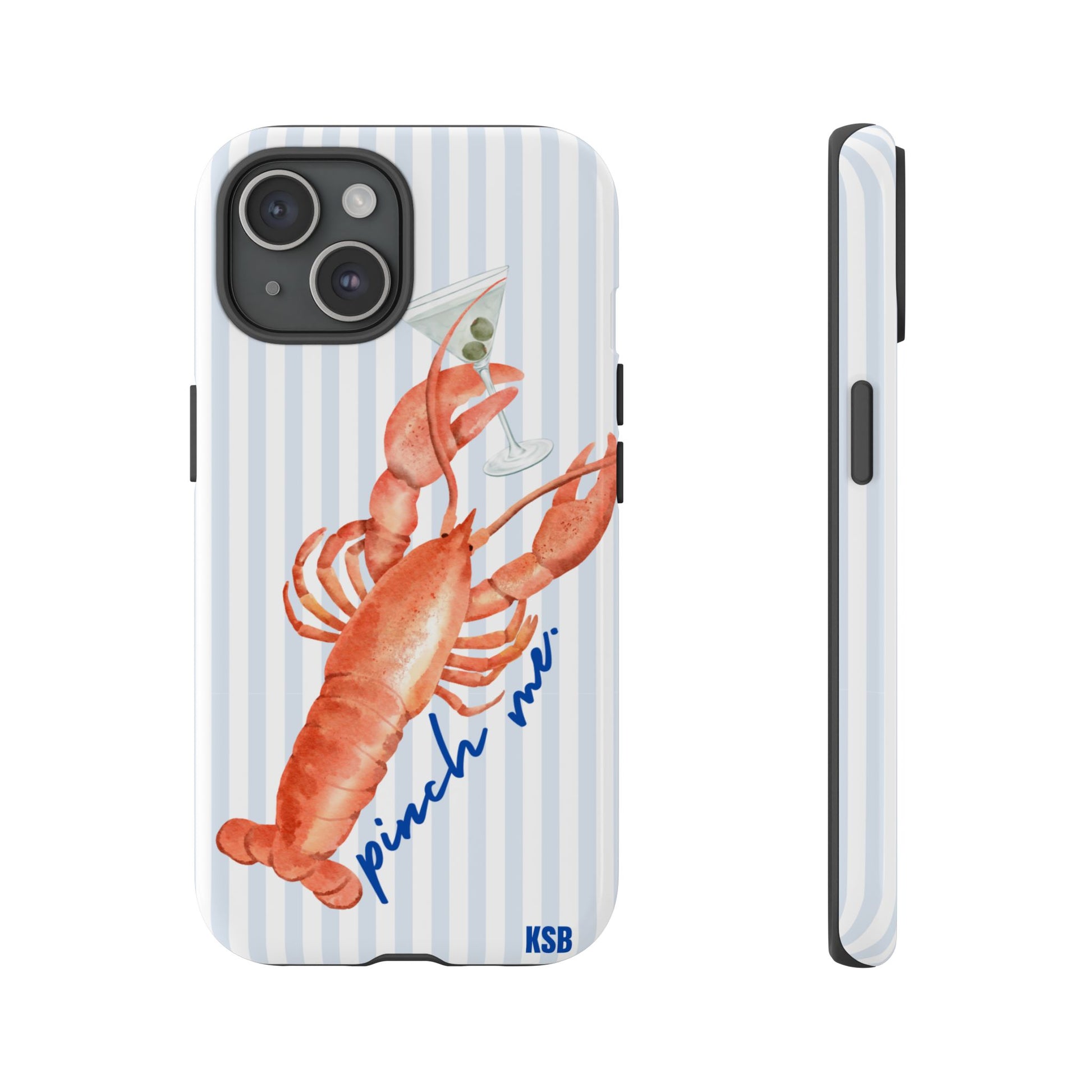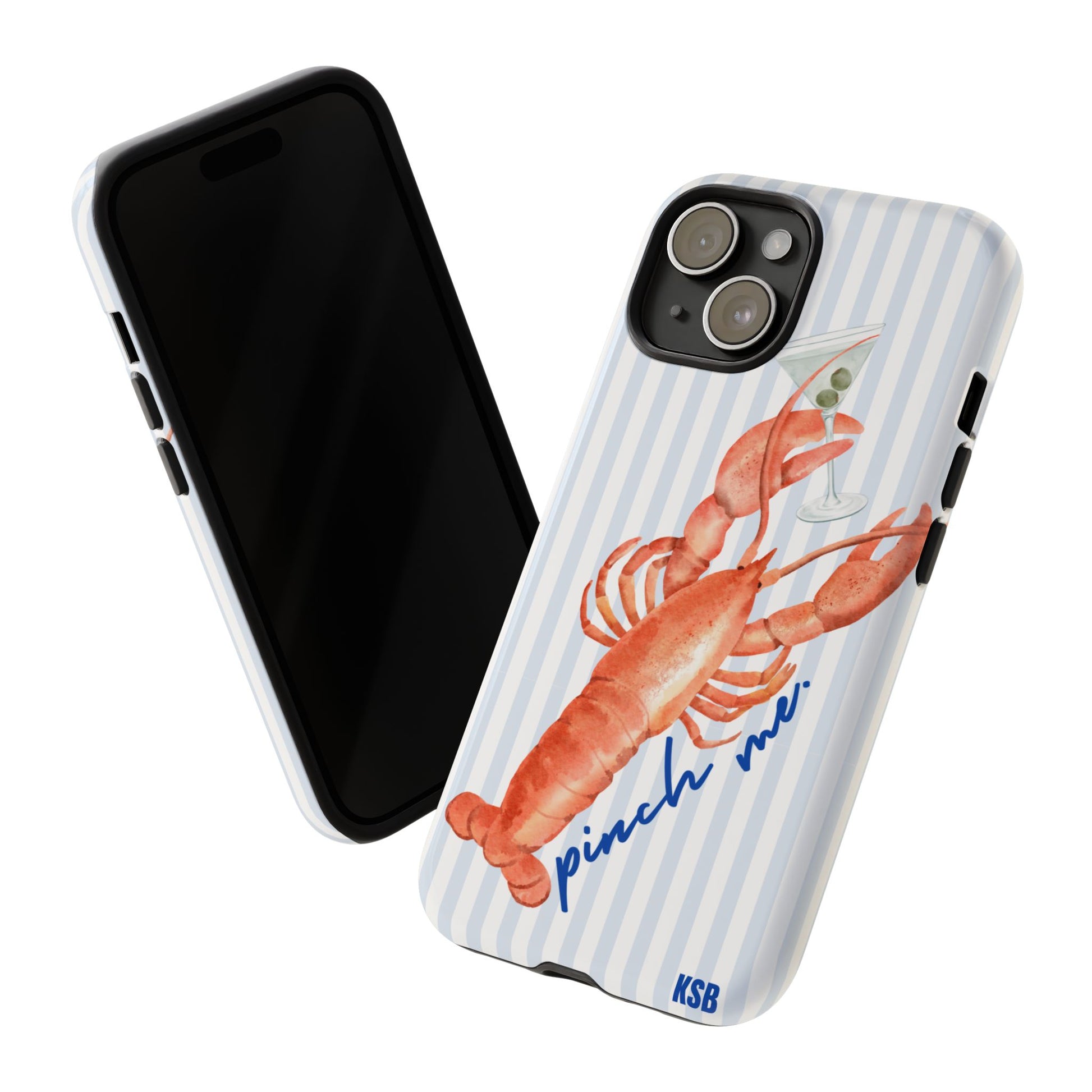 Coastal, cheeky, and effortlessly fun—the Pinch Me phone case is made for days by the water and nights with a martini in hand. Featuring a watercolor lobster holding a cocktail against a classic blue-and-white stripe background, this case brings a nautical twist to your everyday accessory. Slim yet protective, it’s finished with a glossy shine for a polished look.