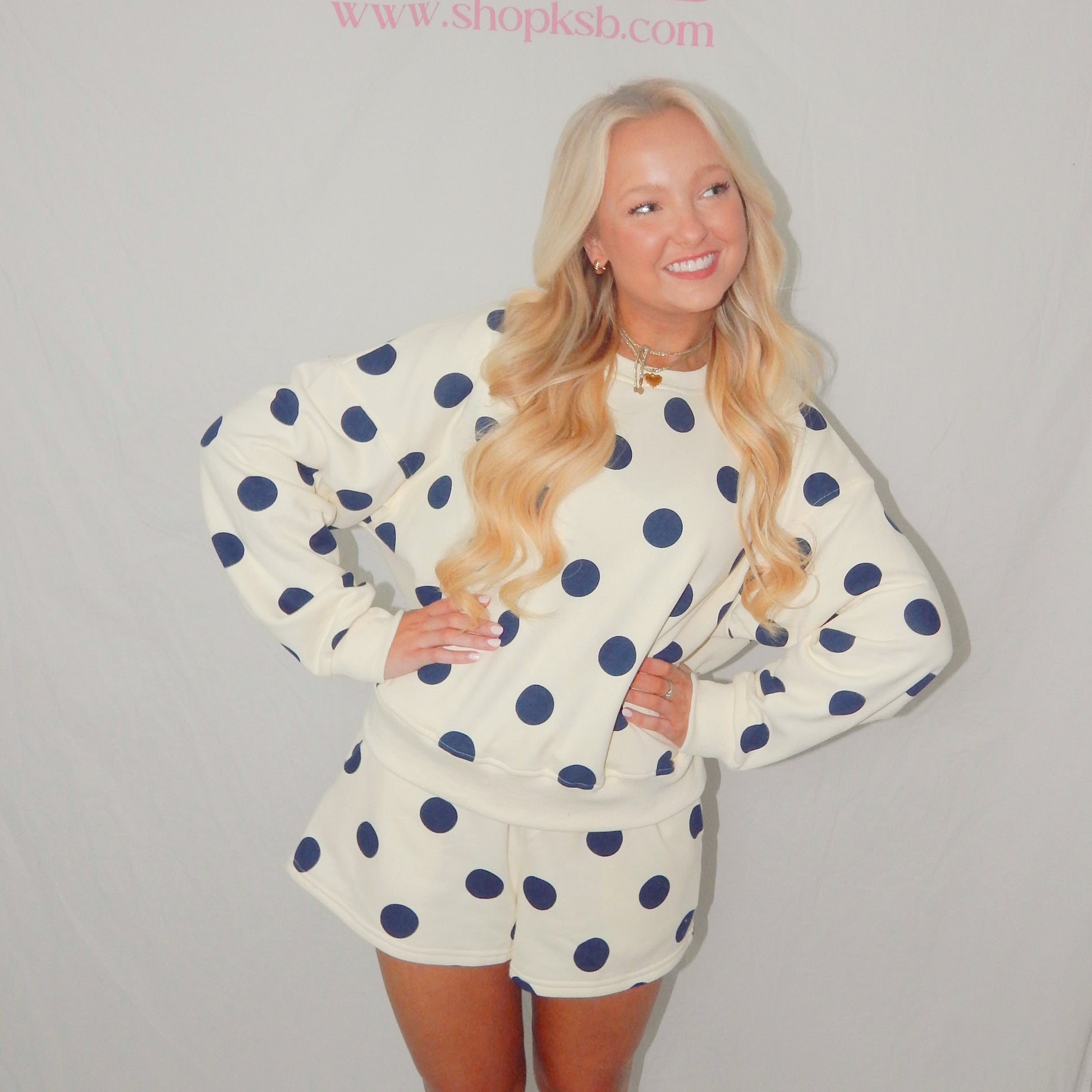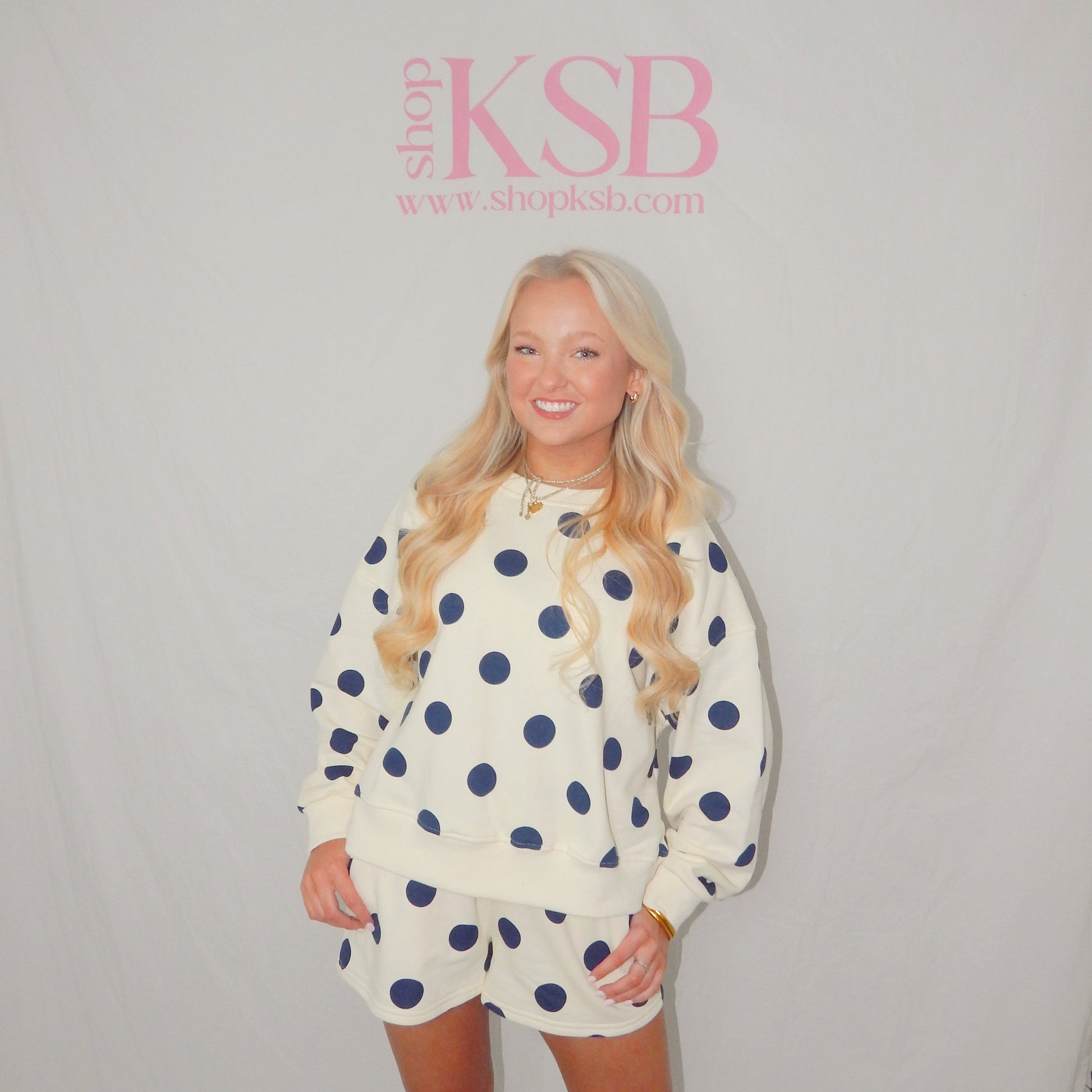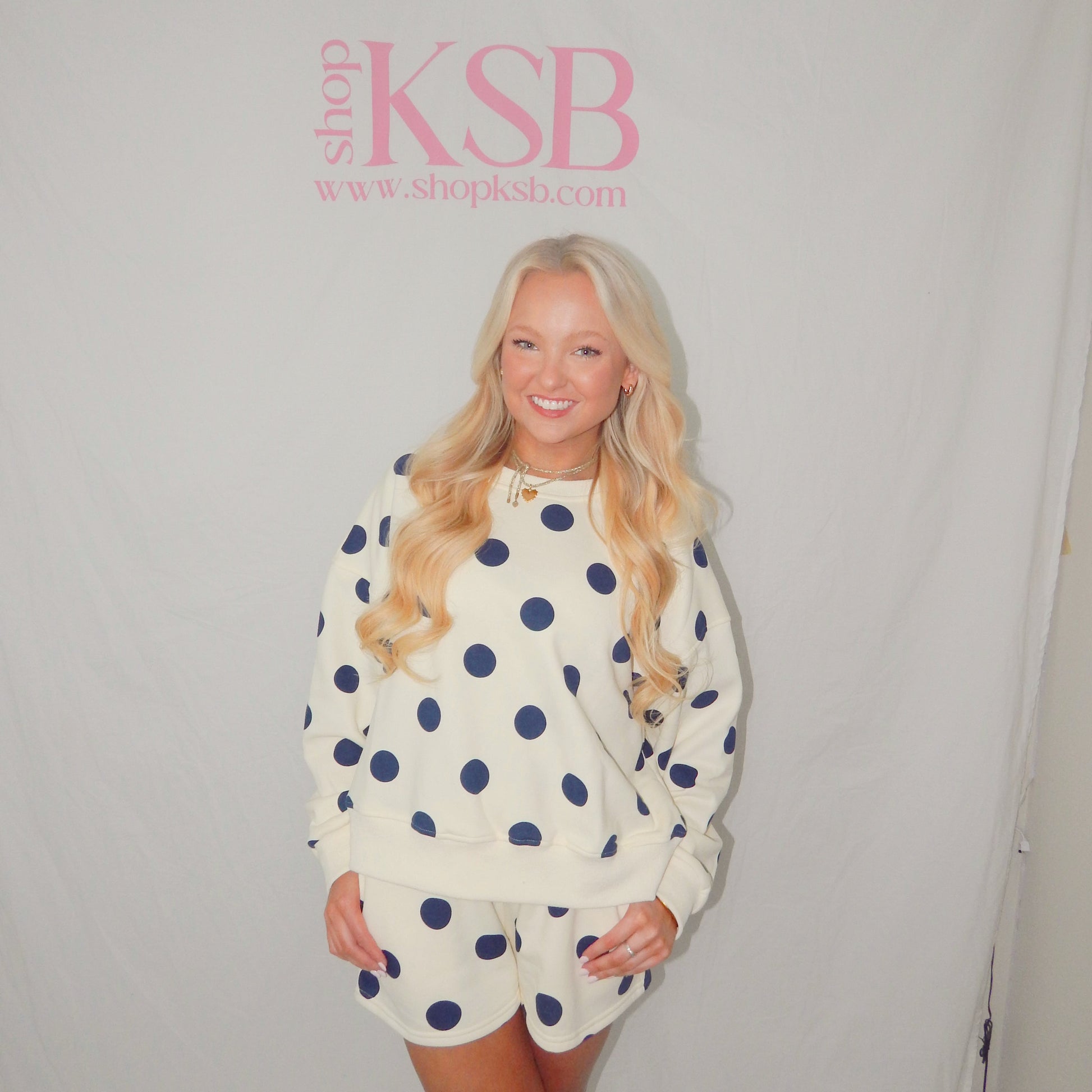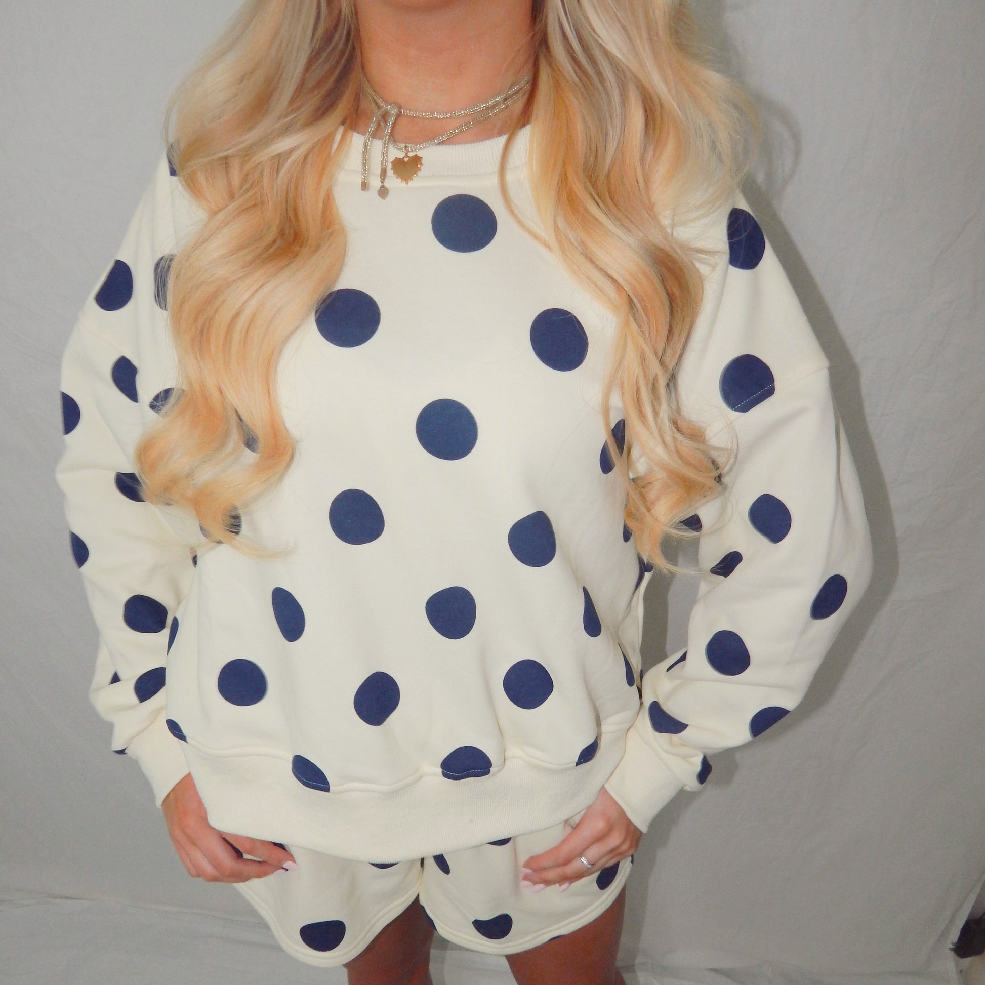 Meet your new cozy obsession. The Soft Spot Sweat Set is the perfect blend of comfort and effortless style, featuring a creamy base with classic navy polka dots for a timeless, elevated lounge look. Made from a thicker, ultra-soft fabric, this set feels plush, warm, and high-quality without being too heavy — perfect for everything from slow mornings to on-the-go errands.